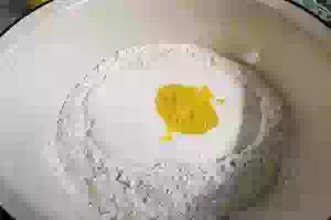 1. В глубокую миску всыпать муку, сделать углубление, влить туда слегка подогретый кефир. В отдельной посуде взбить яйцо, добавить соль и перелить содержимое в миску с мукой.