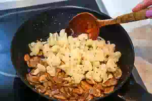 3. В сковороде растопить сливочное или разогреть растительное масло. Добавить грибы и жарить их до готовности, пока они не зарумянятся. Посолить грибы по вкусу и добавить к ним цветную капусту. Готовить все вместе, помешивая, еще примерно 3-4 минуты. Снять начинку для пиццы с плиты, дать ей остыть.
