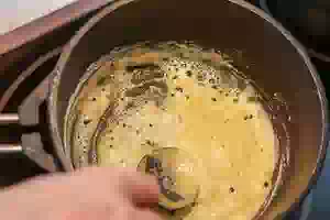 5. Добавить к муке сливочное масло. Размешивать, пока не появится шапочка из кипящей с маслом муки. Снять посуду с мукой и маслом с плиты. Тонкой струйкой при постоянном помешивании вливать молоко. Размешивать венчиком, чтобы не образовалось комочков. Вернуть на средний огонь и проварить соус бешамель до загустения.