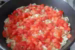 1. Подготовить продукты для начинки. Кубиками нарезать томаты,