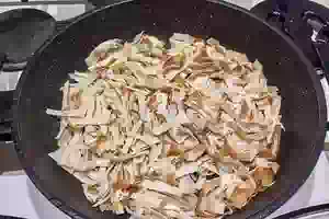 1. Тонкий лаваш порезать соломкой. Получившуюся «лапшу» выложить на разогретую сухую (без масла) толстостенную сковороду.