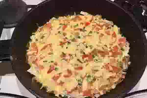 3. Яичную смесь вылить в сковороду, равномерно распределяя по соломке нарезанного лаваша.