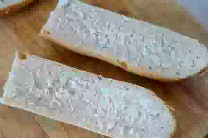 1. Чуть подсохший багет в зависимости от длины разрезать на 2-3 равные части. Затем каждую часть разрезать пополам вдоль, чтобы получить длинные лодочки. Дальше на ваш выбор: 1) оставить багет как есть; 2) примять или выковырять мякиш, делая по центру углубление, в которую будем укладывать начинку.