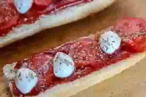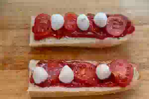 7. Противень застелить бумагой для выпечки (фольгой или силиконовым ковриком), уложить на противень ломтики багета с начинкой и поставить в разогретую духовку на 10-15 минут. Когда багет подрумянится, а сыр расплавится, пиццу в багете с моцареллой и помидорами можно перекладывать на тарелку и сразу, пока она горячая, подавать к столу.