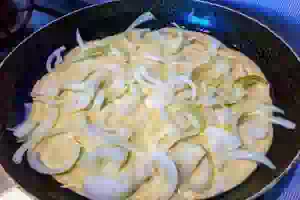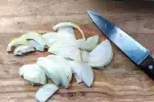 3. Для начинки репчатый лук нарезаем тонкими полукольцами.