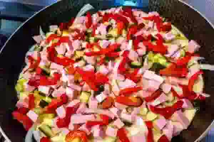 5. Маленькими кубиками нарезаем огурцы, колбасу и сладкий перец. В таком же порядке раскладываем ингредиенты по тесту. Теперь натираем кусочек сыра на мелкой терке и посыпаем начинку.