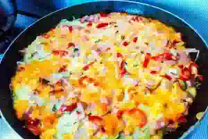 7. Нагреем духовку до 200С и поместим на среднюю полку форму с пиццей. Через 20 минут проверяем её готовность. Если нет духовки, поставьте сковороду на плиту и готовьте на слабом огне до полной готовности. Пицца на майонезе с колбасой, солеными огурцами и сладким перцем готова.