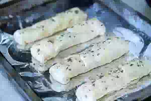 7. Пицца-палочки должны лежать швом вниз. Смазать поверхность теста растительным маслом, посыпать сушеным чесноком и сушеным базиликом. Запекать в предварительно разогретой до 220С духовке около 15 минут. Готовую пиццу переложить на тарелку и можно сразу подавать к столу, пока моцарелла остается тягучей, расплавленной. Вкуснее будет, если каждый кусочек пиццы с горячей моцареллой обмакивать в томатный соус для пиццы.