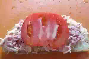 5. Сверху выложите по ломтику помидора. Отправьте пиццу на хлебе в духовку, разогретую до 180 градусов, на 10 минут.
