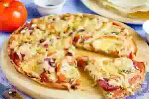 Блинная пицца с колбасой и помидорами