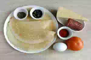 1. Подготавливаем все необходимые ингредиенты для приготовления блинной пиццы с колбасой и помидорами.