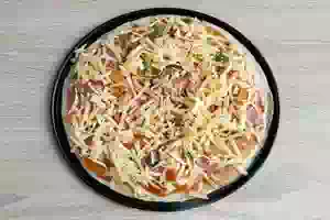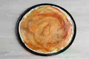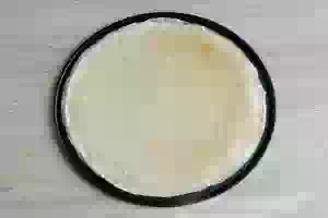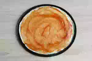 8. Духовку включаем для разогрева до 200 градусов. Основу для пиццы смазываем кетчупом или томатным соусом.