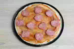 10. Колбасу очищаем от оболочки, нарезаем кружочками и выкладываем на блинную основу.