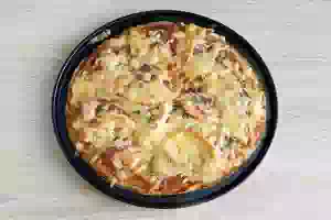 4. Формируем основу для пиццы. В форму для запекания или на противень, покрытый пергаментом, выкладываем один блинчик.