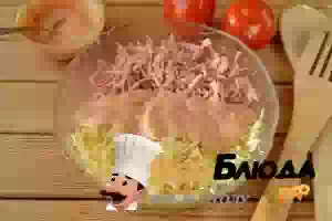 5. Соедините колбасу с сыром и смесью майонеза с кетчупом. Все тщательно перемешайте. Майонез можно не смешивать заранее с кетчупом, но мне кажется, что так лучше перемешивается все.