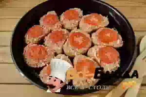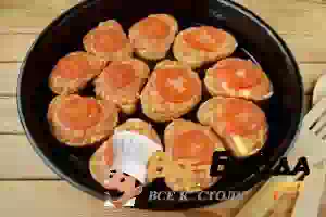 7. Смажьте противень маслом. На каждый ломтик хлеба положите примерно 1 столовую ложку колбасно-сырной смеси. Распределите равномерно. Сверху уложите по колечку помидора.