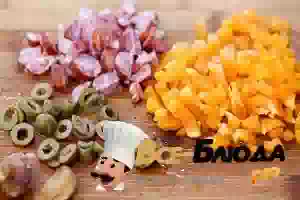 1. Для начинки предварительно запечь в духовке чеснок. Для этого чесночные дольки уложить на лист фольги, посыпать солью и сбрызнуть растительным маслом. Фольгу завернуть и положить в горячую духовку примерно на 30 минут. Готовый чеснок очистить и порубить в кашицу. Остальные продукты для начинки, кроме моцареллы, мелко порезать.