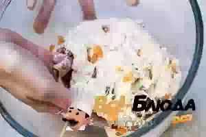 3. Когда тесто подойдет, примешать к нему все продукты, включая печеный чеснок, но кроме сыра.