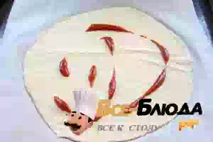 1. Если мидии заморожены, дать им оттаять в холодильнике, хорошо промыть и осмотреть, нет ли в них осколков раковин. Откинуть на дуршлаг, дать жидкости стечь, а затем еще обсушить на полотенце. Тесто раскатать в круглую лепешку диаметром 30-35 см толщиной 2-3 миллиметра. Можно делать это прямо на бумаге для выпечки. Смазать тесто томатным кетчупом, оставляя свободными края.