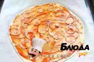 2. Разложить на тесто тонкие полукольца фиолетового лука.