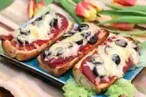 Пицца на багете с колбасой и оливками Ингредиенты: маслины (без косточек) - 50г. багет (вчерашний) - 1 шт. томатный соус - по вкусу колбаса копченая - 120г