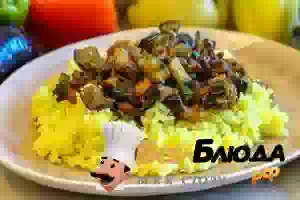 1. Рис промыть, засыпать в кипящую подсоленную воду, добавить куркуму, сливочное масло и варить при слабом кипении. Когда рис хорошо набухнет, снизить огонь под кастрюлей, закрыть крышкой и доваривать рис до полной готовности. Пока варится рис, можно заняться овощами. Баклажаны вымыть, досуха обтереть бумажным полотенцем и нарезать пластинами толщиной около 1 см. Посыпать баклажаны солью и оставить на 30 мину.