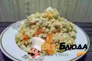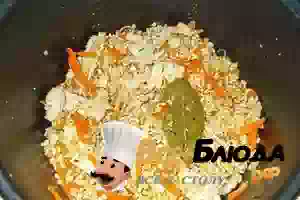 8. Затем залейте крупу кипятком. Вода должна чуть-чуть покрывать плов, перемешайте. Варите плов до готовности перловой крупы. Отключите мультиварку и дайте плову настояться 15-20 минут. Вкусный и сытный плов из перловой крупы готов.