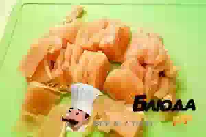 2. Затем с куриной грудки снимите кожу, а филе порежьте тонкими пластинками. В чашу мультиварки налейте растительное масло и выложите порезанное мясо. Включите программу «Мультиповар» 100С на 1 час.