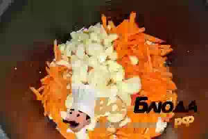 5. Лук порежьте полукольцами и добавьте к мясу и моркови. Продолжайте жарить до мягкости моркови.