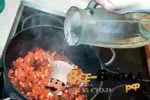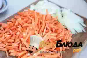 4. Примерно минут через 7, можно добавлять нарезанную соломкой морковь. Посыпать перцем, барбарисом, можно чуть-чуть добавить соли. Влить немного горячей воды, накрыть казан крышкой и оставить на несколько минут, чтобы морковь готовилась на пару. Теперь можно добавить замоченный, промытый нут.
