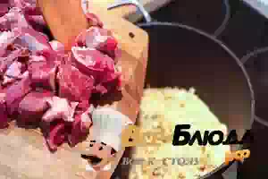 3. В казане нагреть масло, добавить репчатый лук и готовить его, иногда помешивая, до золотистости. Добавить мясо, перемешать. Посолить и посыпать зирой. Огонь не уменьшайте, но и не давайте луку подгорать.
