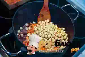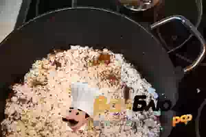 5. Влить столько горячей воды, чтобы она покрывала нут. Закрыть казан крышкой и готовить примерно 20 минут. Время ориентировочное, зависит от нута и вашего риса. Важно, чтобы в конце приготовления рис и нут в плове были нужной консистенции - не каша и не хрустели на зубах.