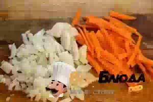 1. Рис для постного плова с грибами обязательно несколько раз промыть, пока вода после промывки риса останется прозрачной, без белой взвеси. Хорошо промытый рис не превратится в кашу, и готовый плов будет рисинка к рисинке. Овощи и грибы промыть. Лук очистить и мелко порубить. Морковь порезать соломкой.