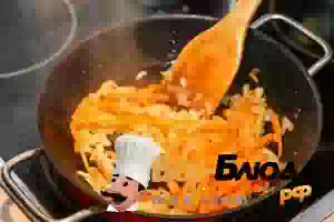 3. В толстостенную посуду налить растительное масло и хорошо прогреть. Добавить лук и, помешивая, пассеровать до мягкости. К луку добавить морковь и продолжать обжаривать овощи, время от времени помешивая их, чтобы не пригорали. Добавить молотый кориандр и немного молотой зиры.