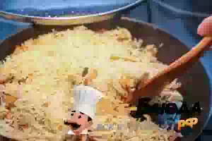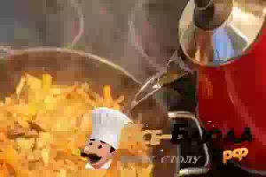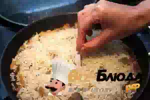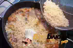 6. В готовый зирвак засыпать рис. Уровень жидкости должен превышать слой риса примерно на 2 см. Если воды меньше, добавьте кипяток из чайника. Дать жидкости в плове закипеть. Уменьшить огонь до среднего.
