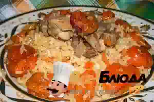 7. Слить с риса воду, крупу выложить ровным слоем поверх мяса с овощами (не смешивать).