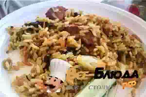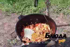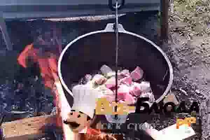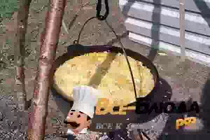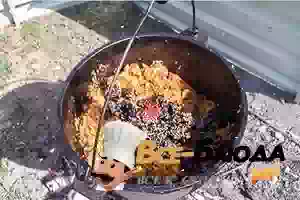 1. 1 кг риса замачиваю на 1 час 1 литром воды, в которой растворена 1 чайная ложка соли, затем воду сливаю. На временной треноге, на цепи, разместили казанок. Сначала прокаливаем казанок на огне и заливаем 0,7-1 см растительного масла на дно казанка. Прокаливаем масло и добавляем мясо.