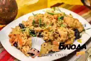 9. В готовый зирвак засыпать подготовленный рис, равномерно распределяя его по поверхности. Воткнуть целую головку чеснока или разделить чеснок на зубчики, но не очищать, а воткнуть в слой риса. Залить рис горячей водой из чайника так, чтобы её уровень превышал слой риса примерно на 1-2 см. Дать жидкости закипеть, уменьшить огонь до чуть ниже среднего и готовить, пока она почти полностью испарится. Когда воды уже не будет видно, уменьшить нагрев до минимального и оставить, пока рис полностью не пропарится. Если рис начнет подгорать, но будет еще недоваренным, в кастрюлю можно влить еще немного кипятка. Готовый плов с курицей и сухофруктами перед подачей перемешать, разложить по тарелкам и подавать к столу. Чеснок можно оставить в плове для украшения готового блюда.