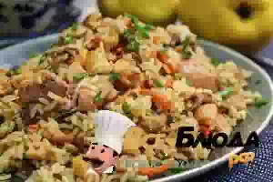 10. Залить рис горячей водой из чайника так, чтобы её уровень превышал слой риса примерно на 1-2 см. Дать жидкости в плове закипеть, уменьшить огонь до чуть ниже среднего и готовить, пока вода почти полностью испарится. После этого прикрыть казан крышкой, выставить минимальный огонь и оставить в таком положении до полной готовности риса. Если вода полностью выкипела, а рис все еще остается недоваренным, можно влить еще немного кипятка. Готовый плов с курицей и айвой перед подачей перемешать, разложить по тарелкам и подавать к столу.
