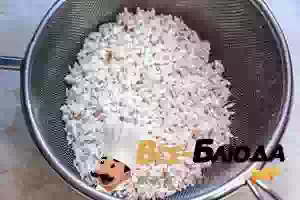 2. Через 40 минут слить с риса воду, откинуть на сито.