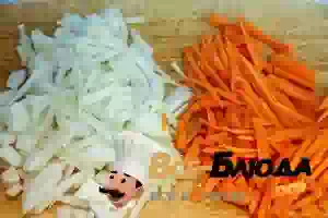 3. Лук очистить, порезать пополам, а затем каждую половинку - на четвертинки и дальше просто порубить. Морковь очистить, порезать соломкой или натереть её на крупной терке. Айву разрезать пополам, удалить сердцевину, после чего каждую половинку порезать вдоль на 3 части, а затем получившиеся ломтики айвы порезать кубиками со стороной около 1 см.