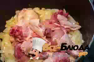 4. В казане или другой подходящей толстостенной посуде разогреть растительное масло. Засыпать нарезанный лук и пассеровать до мягкости. По желанию слегка посолить. Следом положить кусочки курицы. Готовить, помешивая пару минут.