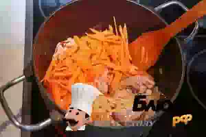 5. Засыпать нарезанную морковь. Продолжать обжаривать овощи с курицей, время от времени помешивая, чтобы не пригорали.
