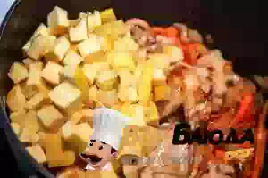 6. Добавить в казан айву, размешать и готовить еще пару минут.