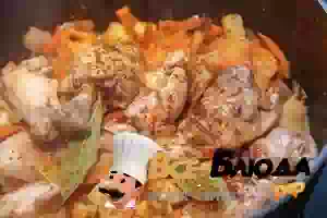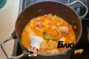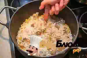 8. Влить в казан примерно 1 л воды из чайника, размешать, прикрыть крышкой и дать закипеть. После закипания положить соль по вкусу и готовить под крышкой на слабом огне около 20 минут.