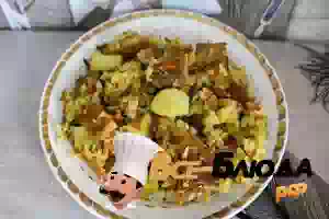 8. С краев сковороды аккуратно поднять рис горкой и закрыть крышкой меньшего размера сковороды. Так рис полностью приготовится, а лишняя влага испарится. Аппетитный рассыпчатый плов готов.