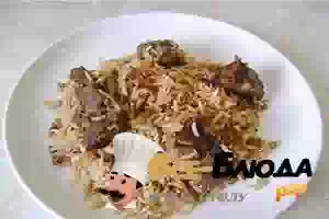 8. Выложить сверху мясо. Накрыть плотно крышкой, подложив под неё полотенце для впитывания пара и оставить ‘на свечке’ минут на 45, или в духовке на то же время. Подают, выложив мясо вниз блюда и рис с машем сверху. Не перемешивая!