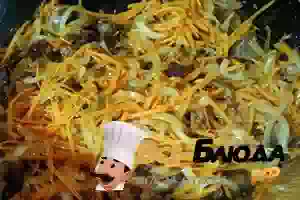 6. Когда лук приобретёт лёгкую прозрачность, то добавить к луку морковь. Готовить до лёгкой готовности овощей.