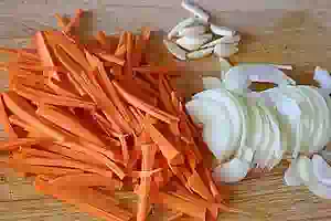 4. Лук очистить и порубить полукольцами. Морковь вымыть, очистить и порезать соломкой (или натереть на терке для корейской моркови). Чеснок почистить, нарезать дольки лепестками.