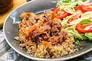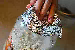 8. Обернуть горло банки сложенным вдвое куском фольги. Поставить банку с мясом и рисом в холодную духовку. Для страховки на случай, если банка лопнет, поставить банку в поддон (или глубокую чугунную сковороду). Готовить первые 30 минут при температуре 150С, затем увеличить нагрев до 180С и продолжить тушить баранину с рисом до готовности еще примерно полтора часа. Перед тем, как достать банку из духовки, проверьте готовность риса. Если вам покажется, что рис все еще остался жестким, то снова закройте банку фольгой и оставьте банку в духовке еще на 30 минут. Готовый НЕ плов из баранины осторожно извлечь из банки, перемешать, чтобы мясо равномерно распределилось, и можно раскладывать по тарелкам.
